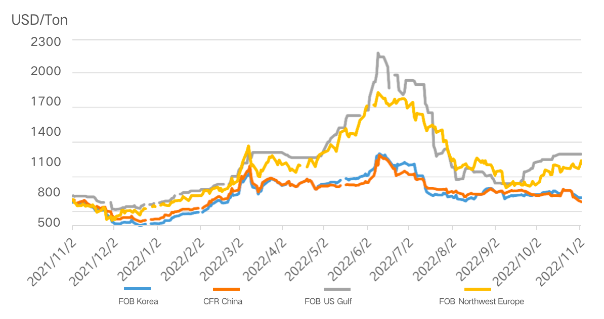 Figura 2. Gráfico de tendências do mercado de xileno isomerizado na Ásia, América e Europa de 2021 a 2022